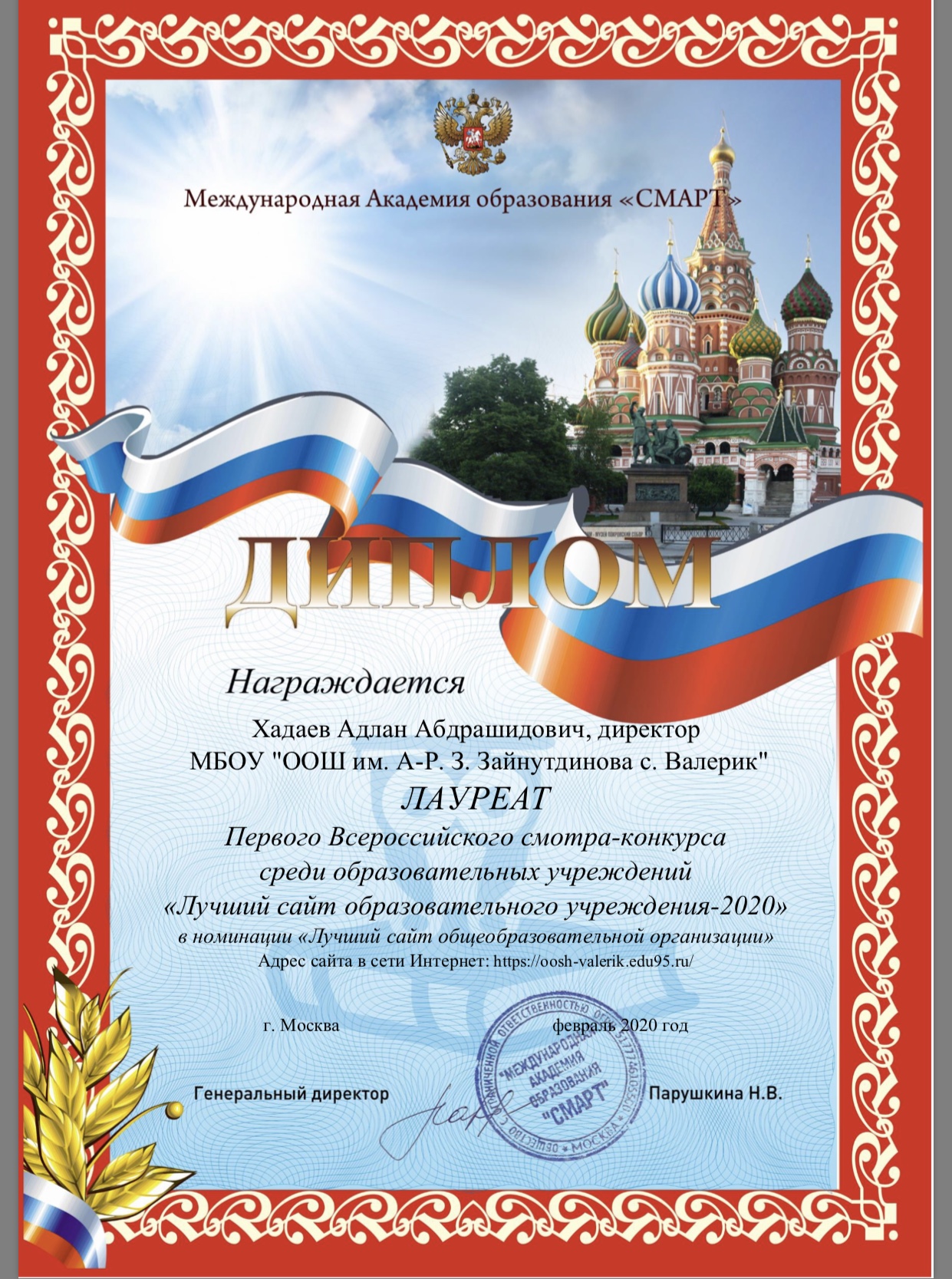 А.А. Хадаев директор школы, Участник конкурса «Лучший сайт образовательного учреждения- 2020» в номинации «Лучший сайт общеобразовательной организации - 2020».