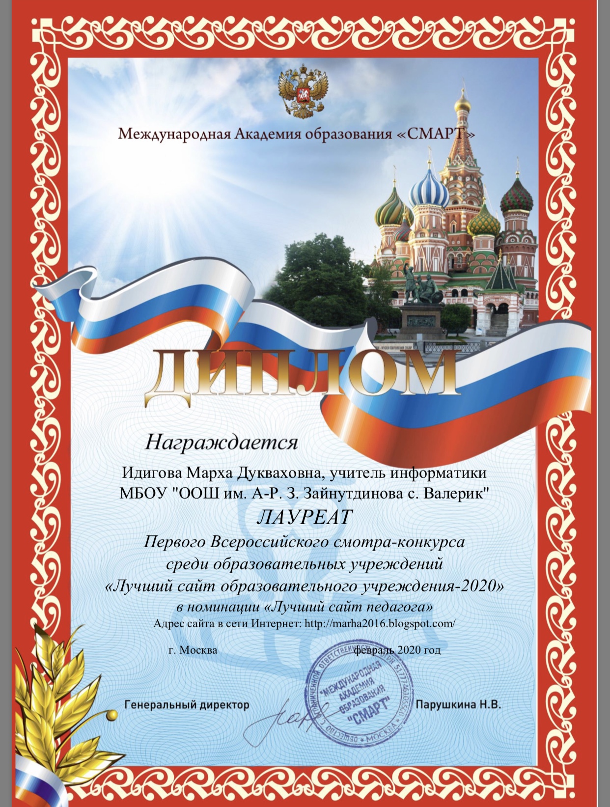 Заместитель директора по ИКТ ИДИГОВА М.Д. участница конкурса «Лучший сайт образовательного учреждения - 2020» в номинации «Лучший сайт педагога».