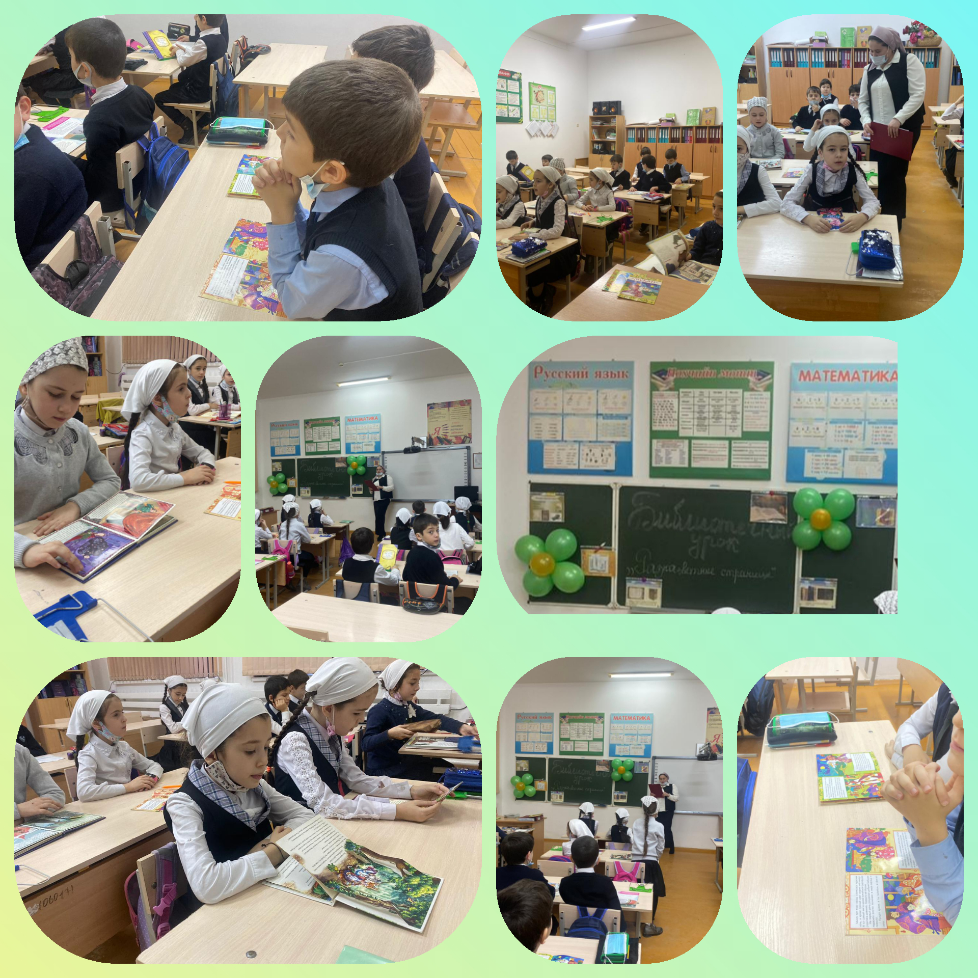 Сегодня педагог-библиотекарь МБОУ "ООШ им. А-Р. З. Зайнутдинова с.Валерик" Чуликова Х. Р. провела библиотечный урок во втором классе на тему "Разноцветные страницы"