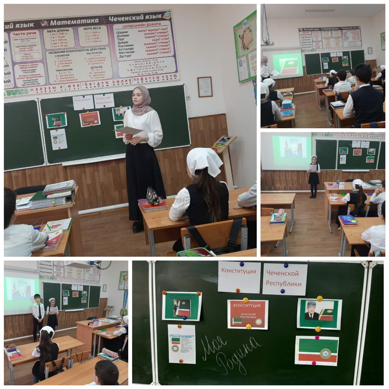 Классный час, посвященный празднованию Дня Чеченской Конституции, проходит в 3 А классе. Классный руководитель Асхабова Л. А.