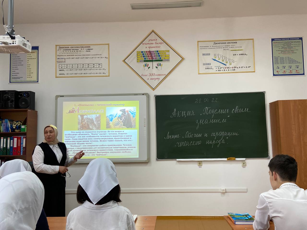 28.04.2022В рамках акции "Поделись своим знанием. Новые горизонты", организованной Российским обществом "Знание", учитель чеченского языка и литературы, призёр различных конкурсов педагогического мастерства Тутаева Фатима Хизировна выступила перед обучающимися 0-х классов школы с лекцией "Обычаи и традиции чеченского народа".