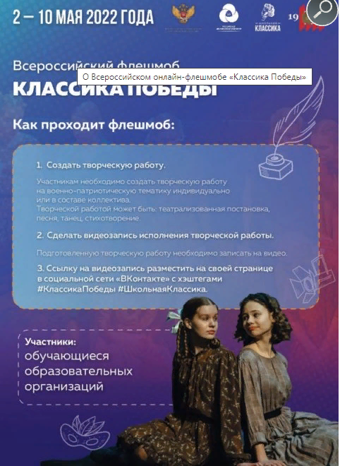 07.05.2022Информируем о проведении Всероссийского онлайн-флешмоба «Классика Победы», который реализуется в рамках Всероссийского проекта «Школьная классика».