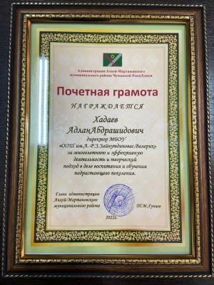 Директор школы Хадаев Адлан Абдрашидович награждён Почетной грамотой Администрации Ачхой-Мартановского муниципального района за многолетнюю и эффективную деятельность и творческий подход в деле воспитания и обучения подрастающего поколения.