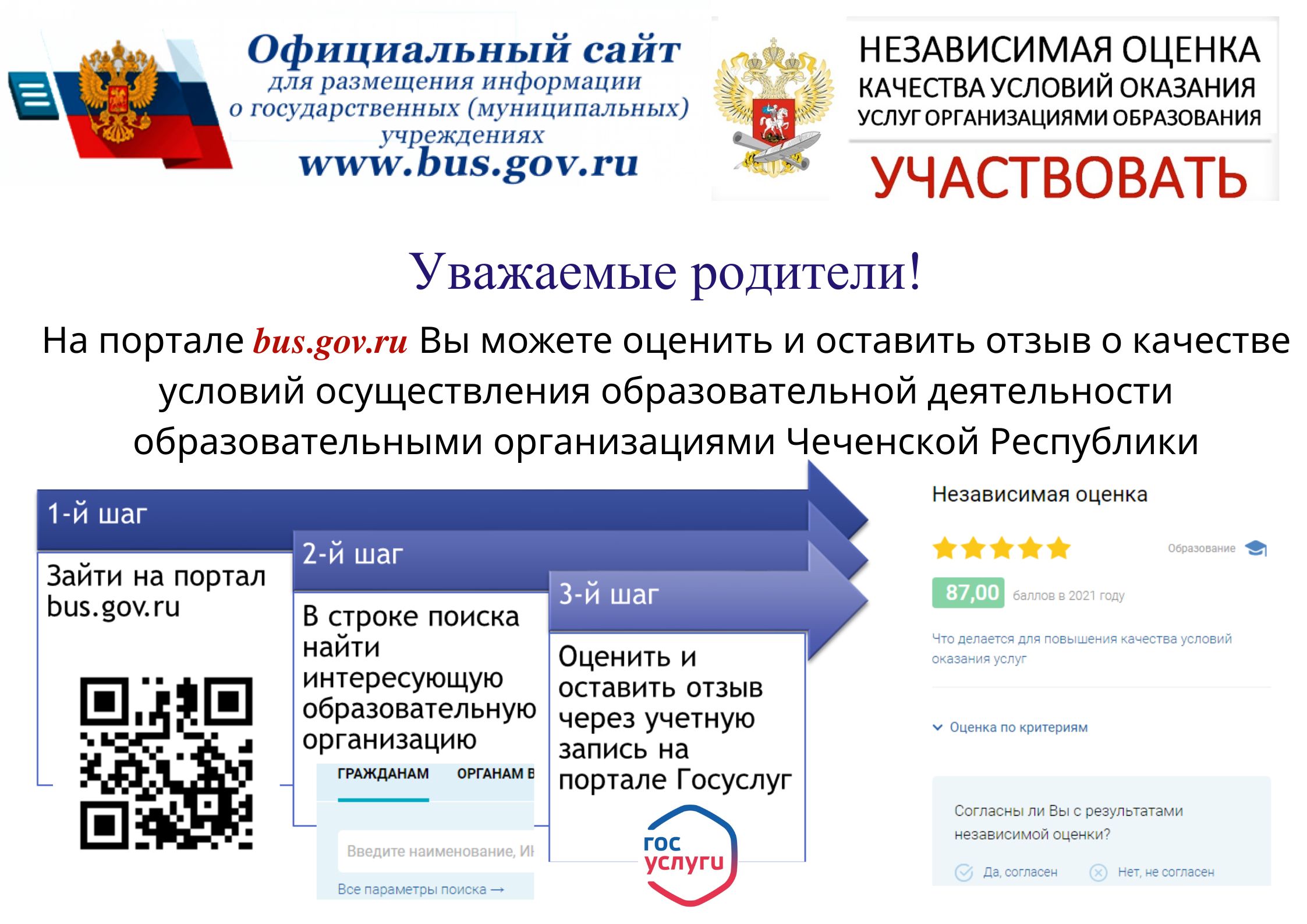 Уважаемые родители и обучающиеся старше 14 лет, у вас есть возможность участвовать в оценке условий осуществления образовательной деятельности образовательными организациями Чеченской Республики.