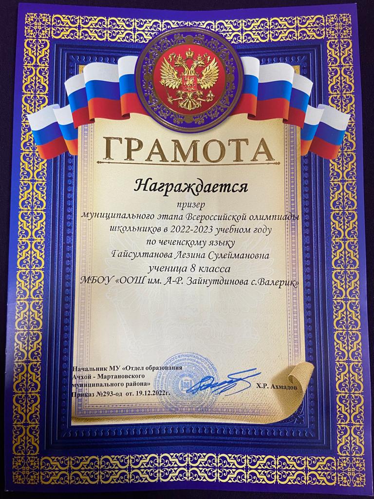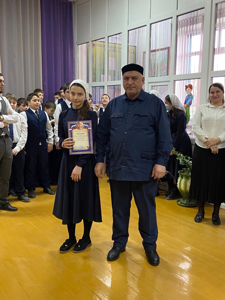 23.01.2023Сегодня на еженедельной общешкольной линейке ученице 8 а класса Гайсултановой Лезине вручена награда за призовое место в муниципальном этапе Всероссийской Олимпиады школьников по чеченскому языку. Для девочки уже стало традицией завоевывать призовые места на олимпиадах по этому предмету. В прошлом году она завоевала 2 место в регинальном этапе Олимпиады. Желаем Лезине дальнейших успехов в учебе!