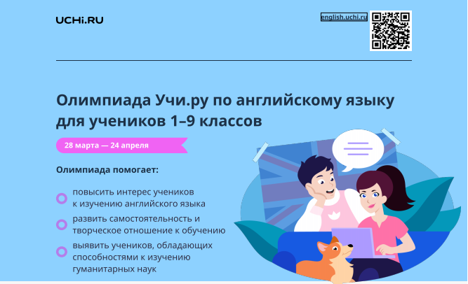 13.04.2023В период с 28 марта по 24 апреля 2023 года на платформе Учи.ру проходит ежегодная некоммерческая просветительская инициатива — Всероссийская онлайн-олимпиада Учи.ру по английскому языку для учеников 1–9 классов (далее — олимпиада). Сайт олимпиады — https://english.uchi.ru.