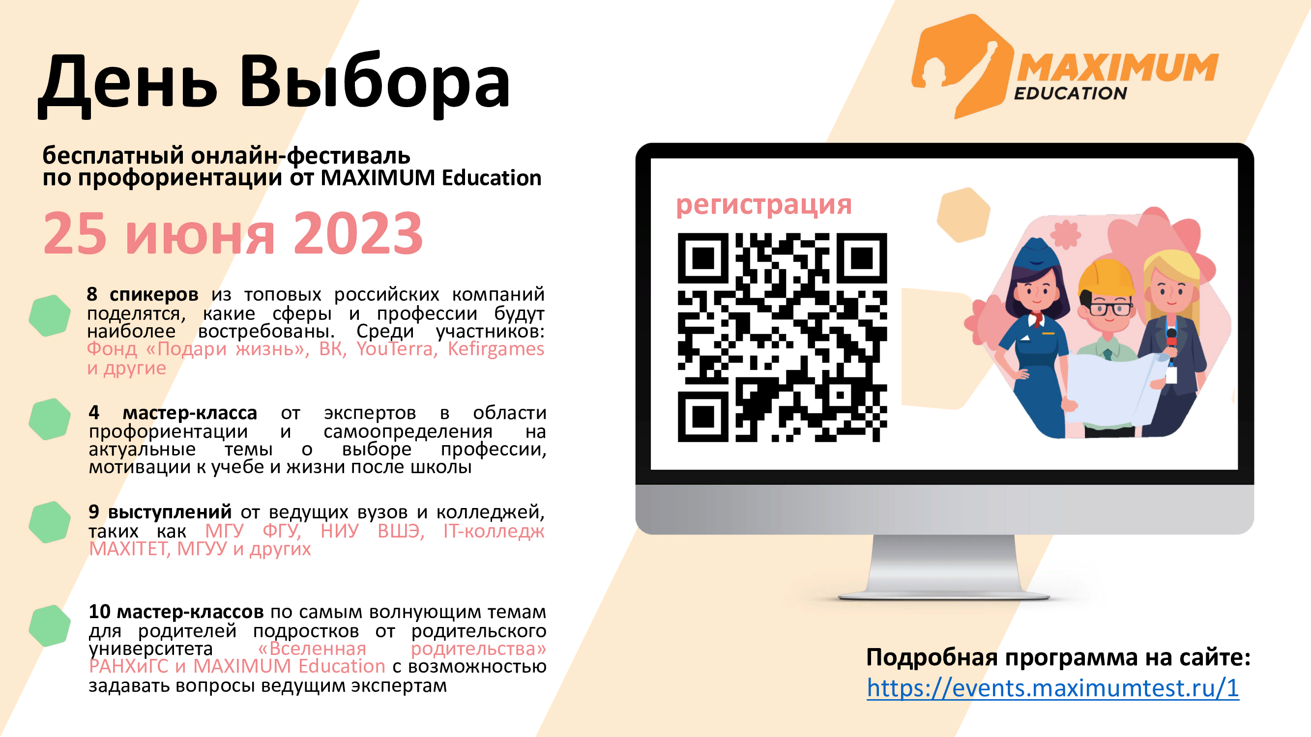 06.06.2023Информируем вас о проведении и возможности принять участие учащимся 5 - 11 классов и их родителям в бесплатном фестивале по профориентации "День Выбора", который пройдёт в онлайн-формате 25 июня 2023 года.