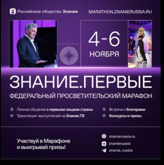 01.11.2023С 4 по 6 ноября 2023 года состоится Федеральный просветительский марафон Российского общества «Знание» — " Знание.Первые". Марафон стартует в день открытия Международной выставки-форума «Россия» на ВДНХ в Москве и будет проходить на шести площадках в разных павильонах.