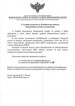 16.10.2017Пошаговый сценарий Всероссийской встречи с родителями руководителя Рособрнадзора Сергея Сергеевича Кравцова