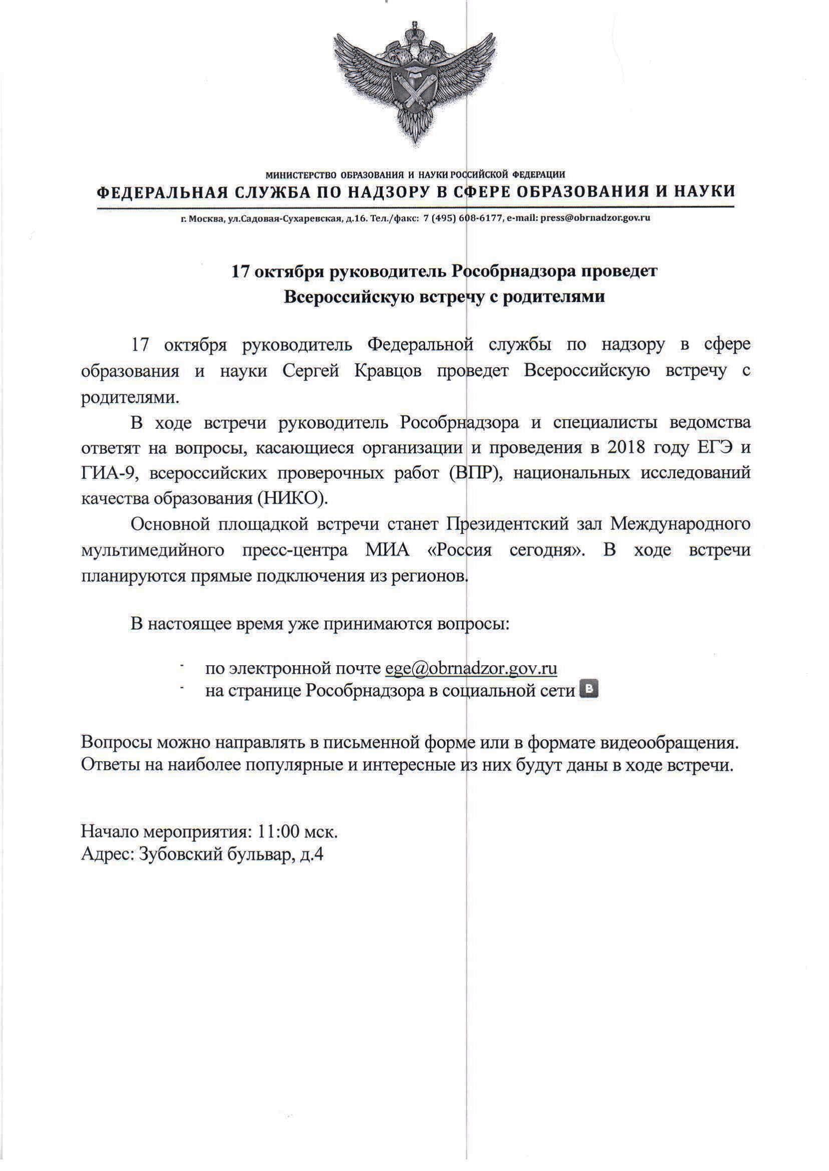 Сегодня мы присутствуем на Всероссийской встрече с родителями руководителя Рособрнадзора Сергея Кравцова. Подобная встреча проводится в третий раз. В ходе нее родители школьников смогут задать свои вопросы о том, как будет проходить ЕГЭ, сочинение, итоговая аттестация в 9 классах, всероссийские проверочные работы, исследования качества образования.