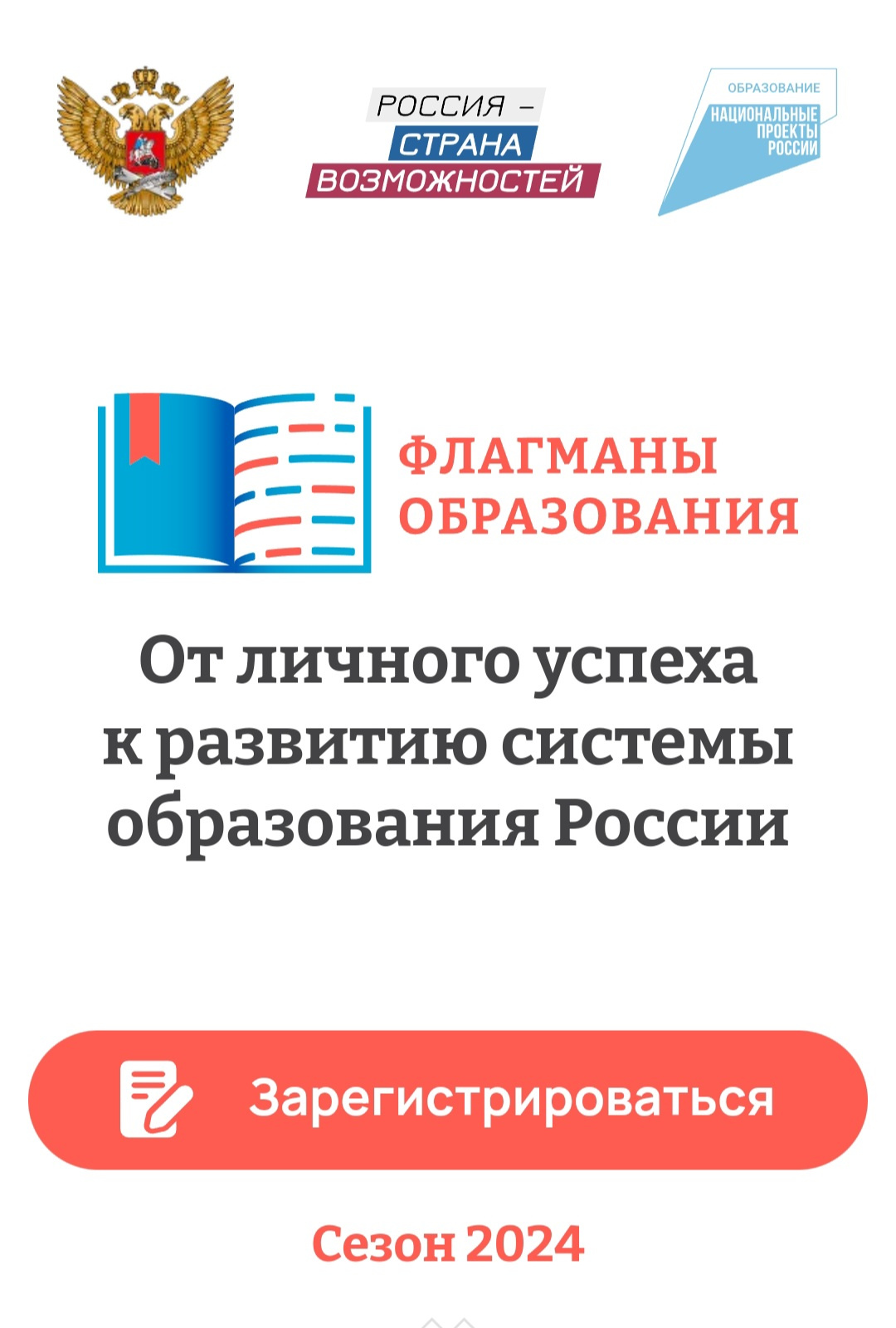 07.05.2024ПРОДОЛЖАЕТСЯ ПРИЕМ ЗАЯВОК НА УЧАСТИЕ В НОВОМ СЕЗОНЕ КОНКУРСА «ФЛАГМАНЫ ОБРАЗОВАНИЯ» ПРЕЗИДЕНТСКОЙ ПЛАТФОРМЫ «РОССИЯ – СТРАНА ВОЗМОЖНОСТЕЙ»